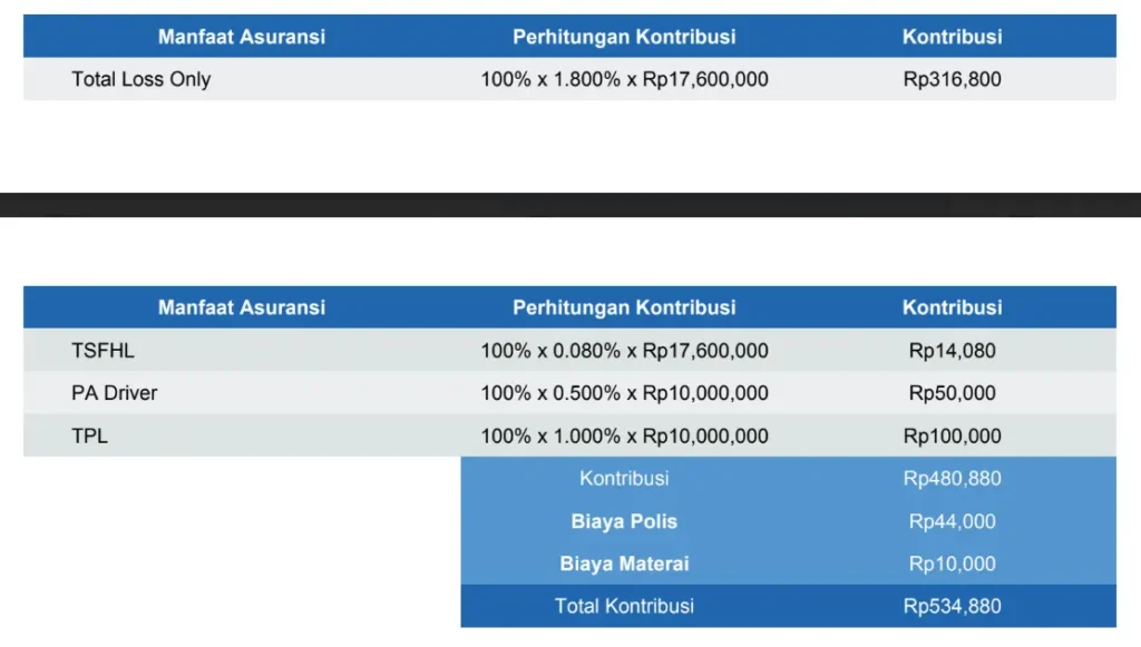 Tanggung Jawab Hukum Pihak Ketiga, dengan manfaat asuransi atas tuntutan hukum dari pihak ketiga yang secara langsung disebabkan oleh kendaraan yang diasuransikan, dengan limit maksimal hingga Rp10.000.000.